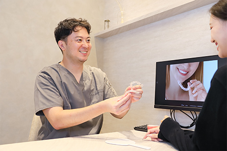 当院では、成人矯正の無料相談を平日・土日ともに対応しています。治療方法や費用、期間についてしっかりと説明し、患者さまのお悩みや疑問を解消します。お仕事や学校で平日が難しいかたも土日に相談できるので、安心してご来院いただけます。お気軽にお申し込みください。
